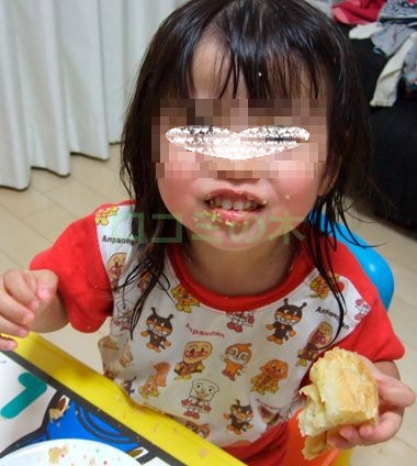 パンをおいしそうに手づかみで食べる赤ちゃん